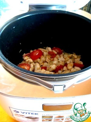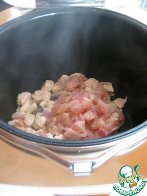 • Нарезать куриное филе. Режим "поджаривание". Слегка обжариваем филе. Переложить его в отдельную тарелку.