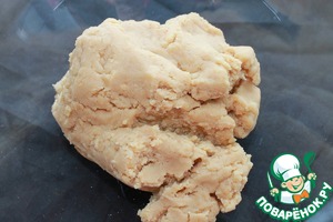 К молотому печенью добавить сыр, кофе, коньяк и очень хорошо размять (лучше всего руками). Получится влажная и мягкая по текстуре масса.