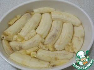 Форму смазать растительным маслом, уложить бананы плотным слоем. Полить их соком лимона. -
