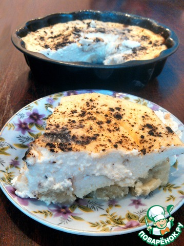 Творог подсластить по вкусу, положить яйца, растопленное масло, перемешать. Вылить поверх бананов.