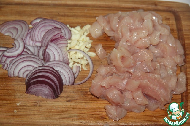 Для начала нам нужно приготовить начинку для пирога. Нарезаем лук полукольцами, мелко чеснок и кубиками куриное филе.