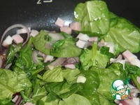 В мультиварке, у меня модель Vitek VT-4205, выбираем программу "Жарить" - 15 минут. Готовим 2 минуты лук и чеснок, затем добавляем кубики грудинки и свежий шпинат. Готовим еще 5 минуток. |