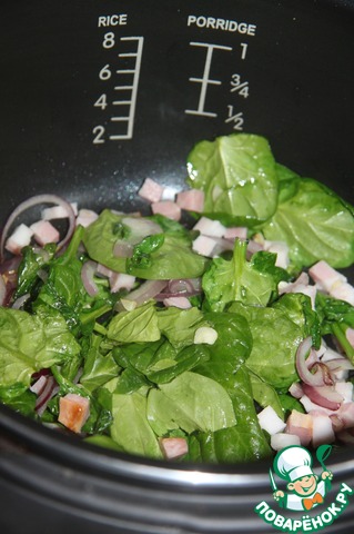 В мультиварке, у меня модель Vitek VT-4205, выбираем программу "Жарить" - 15 минут. Готовим 2 минуты лук и чеснок, затем добавляем кубики грудинки и свежий шпинат. Готовим еще 5 минуток.