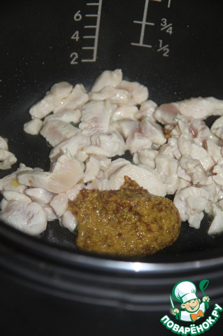 Перекладываем начинку в отдельную посуду, а в мультиварку выкладываем курицу с горчицей. Продолжаем готовить на той же программе еще 5-7 минут.