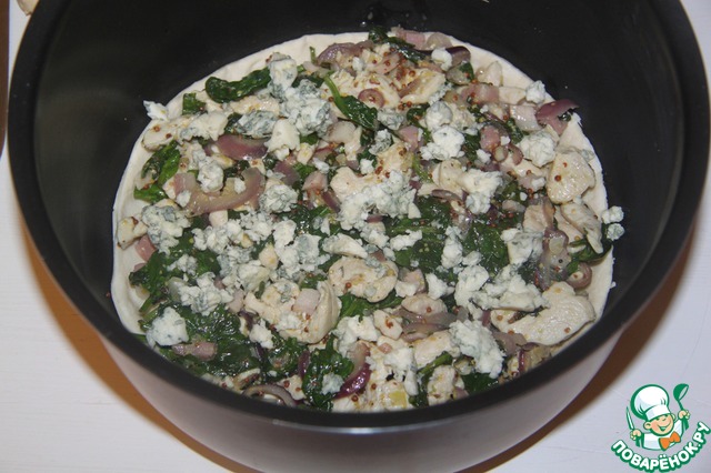 На дно чаши выкладываем первый круг так, чтобы бортики теста поднимались по чаше на 2 см. Выкладываем сверху начинку и посыпаем сыром.