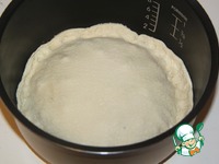 На дно чаши выкладываем первый круг так, чтобы бортики теста поднимались по чаше на 2 см. Выкладываем сверху начинку и посыпаем сыром. |