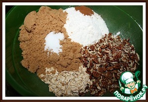 2. Соединить муку, xлопья овсяные, орехи, коричневый сахар, корицу, имбирь (если нравится) и соль, перемешайте.