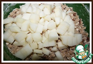4. Добавьте груши (очищенные и нарезанные на квадратики 1Х1 см.) и перемешайте. Отправьте в холодильник на 20 мин.