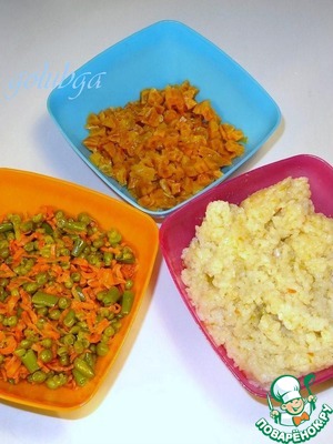 Я приготовила все для теплого салата: тушеные овощи, курагу с изюмом и рис.