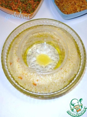 Рис выложите на блюдо в форме кольца с отверстием посередине (поставьте банку на середину).