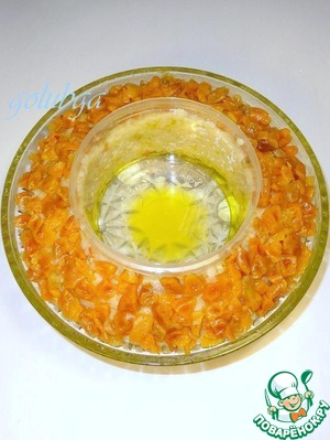 Курагу и изюм промойте и залейте горячей водой, оставьте на 20 мин.. Затем слейте воду и нарежьте курагу на кусочки.