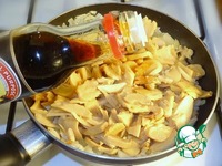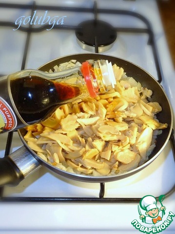 Мелко нарезаем отваренные грибы и добавляем к луку, слегка подсаливаем, можно добавить специи, перемешиваем и обжариваем. Затем вливаем 2 ст. л. соуса Kikkoman и еще 2-3 мин. держим на огне. |