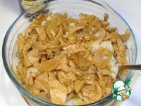 К картофелю кладем грибы с луком. Если у вас начинка слишком плотная, вы можете добавить 1 ст. л. соуса Kikkoman. Включаем духовку на 180 С. |