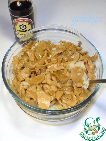 К картофелю кладем грибы с луком. Если у вас начинка слишком плотная, вы можете добавить 1 ст. л. соуса Kikkoman.