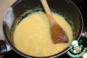 Непрерывно помешивая, влить тоненькой струйкой молоко