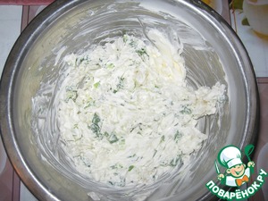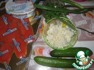 Смешать в миске творожный сыр, рис, зелень, огурец, перемешать.