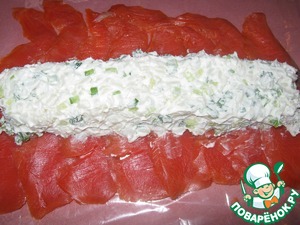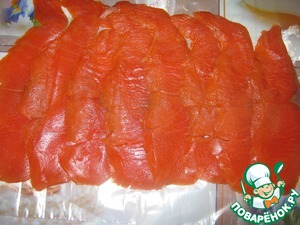 Я взяла уже нарезанное филе нерки подкопченой. Кусочки филе положить внахлёст на пищевую плёнку.