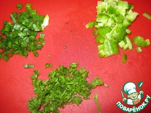 Приготовим начинку. Половинку огурца нарезать кубиками мелко, петрушку и лук также нарезать.