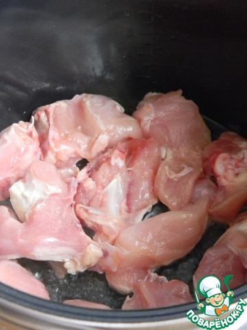 Включить мультиварку, режим "поджаривание", на растительном масле обжарить курицу.