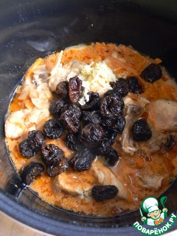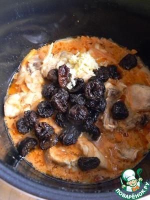После того, как пройдет 30 минут добавить чернослив, чеснок и перец чили.