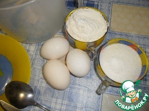 - Сахар (1 стак.-в бисквит; 3 ст. л. для заливки верхнего коржа; 3 ст. л. для сиропа (для пропитки коржей) — 1 стак.