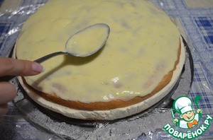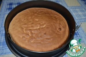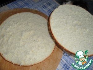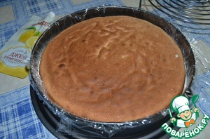 Бисквит разрежем по горизонтали и пропитаем сиропом (сварить 0,5 стак. воды с сахаром и 1 ст. л. джема)