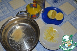Готовим заливку для верхнего коржа. Получаем на терке с лимона цедру, выжимаем сок половины лимона, нагреваем, добавляем сахар.