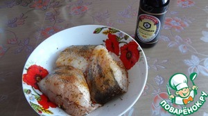 Берем порционные кусочки судака. Высыпаем приправу "Для рыбы" (состав: лук, укроп, лавровый лист, морковь, перец черный, чеснок, эстрагон, мускатный орех), солим и обтираем все кусочки нашей рыбы.