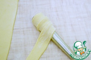 Тесто раскатать в квадрат или прямоугольник толщиной 0.3-0.5 см. Нарезать на полоски шириной примерно 1 см и длиной 20 см. Полоски теста намотать на конусы "внахлест".
