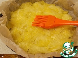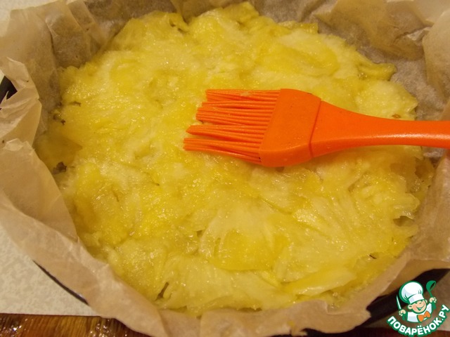 Маленькую сковороду застелить пекарской бумагой. Выкладываем ананасы слоями. Каждый слой смазываем смесью и посыпаем простым сахаром.