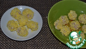 Смешать рыбу с рисом, натёртыми белками и с маслом от рыбы, добавить майонез. Добавить масло от консерв, добиваясь такой консистенции, чтобы можно было слепить шарики.