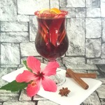 Выливаем вино у кастрюлю, даем немного подогреться, оно не должно прям кипеть и бурлить, все делаем на медленном огне, каркаде, заранее приготовленный, добавляем к вину, вводим мёд, немного сахара, выдавливаем чуть сока лимона и апельсина по ч. л. и кидаем пару кусочков цитрусов с кожурой, добавляем пару долек яблока и вводим все специи. Когда вино стало подкипать, снимаем с огня, накрываем крышкой и настаиваем 10 мин.