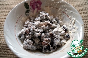 Всыпьте отложенную муку в сухофрукты и слегка обваляйте их в ней. Добавьте сухофрукты к сухой и мокрой смесям. В данном хлебе я специально сухофрукты добавляю сразу же. В готовом изделии они не должны попадаться большими кусками, они должны частично раствориться в хлебушке, создавая его неповторимый вкус.