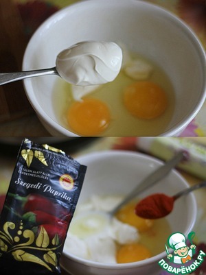 Приготовим маринад. Для этого к яйцам добавим майонез (или сметану) и молотую сладкую паприку.