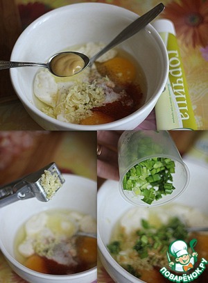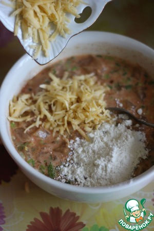 Затем к общей массе добавить муку и тертый сыр. Все тщательно перемешать