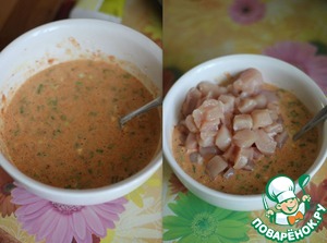 Все тщательно перемешать и в полученный маринад добавить кусочки филе. И еще раз все хорошо перемешать. Оставить мариноваться минут на 20-30.