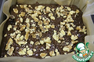 Форму 22 см смазать маслом и постелить пергаментную бумагу. Положить ровным слоем тесто. Сверху посыпать измельченными орехами. Я использовала грецкие орехи (очень я их люблю). Но можно взять любые, а можно и без них.