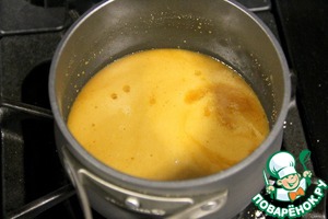 Сначала делаем карамель. Для этого положить 25 г сливочного масла и 75 г сахарной пудры в кастрюлю с толстым дном и нагревать на среднем огне, помешивая деревянной ложкой. Масса должна приобрести карамельный цвет. Не волнуйтесь, если масса начнет расслаиваться. При дальнейшем помешивании она станет однородной.