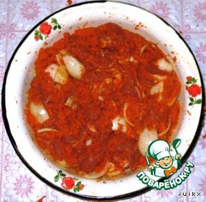 Перемешать и тщательно пожать руками. При этом морковь пускает сок, мясо пускает сок. Все это перемешивается с приправами и когда мясо настаивается, то втягивает в себя уже все соки.
