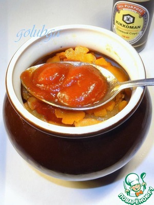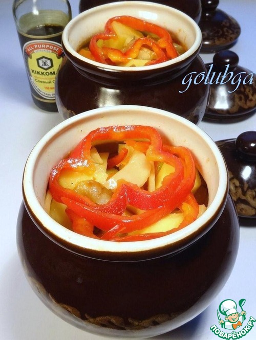 В стакан с водой (150мл) добавить 4 ст. л. соевого соуса Kikkoman ( 1 ст. л. на 1 горшочек), перемешать и полить поровну (3-4 ст. л.) овощи, подсолить и перемешать.