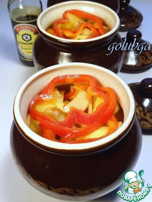В каждый горшочек положить поровну чеснок, несколько колец лука с маслом и болгарского перца. Добавить по 2 горошины душистого перца, по 1 ст. л. вашего любимого кетчупа.