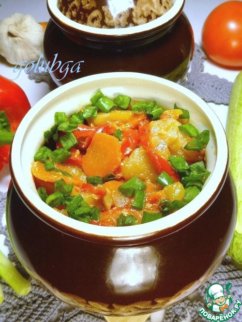 Тушить овощи в разогретой духовке при t 170-180 С, в течение 1 часа. Готовность можно проверить по картофелю.