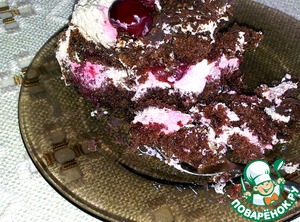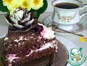 На мой день рождения мы с сыном делали торт. Этот день был среди недели, поэтому готовили торт не за один день. Сын ел уже такой торт и сказал, что вкуснее торта не пробовал. А я это название даже и не слышала. Пекла бисквит, взбивала сливки, занималась вишней, а Евгений делал украшения - розы и всё, что связано с шоколадом. Торт делали на свой вкус. Собирали его вместе. Строго не судите.