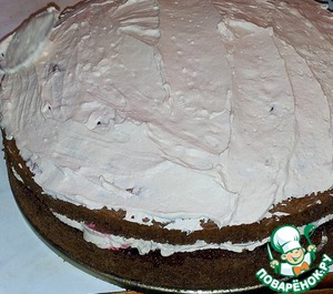 На пропитанный сиропом нижний корж обильно нанести сливки и разровнять. На сливки выложить плотно друг к другу вишни.
