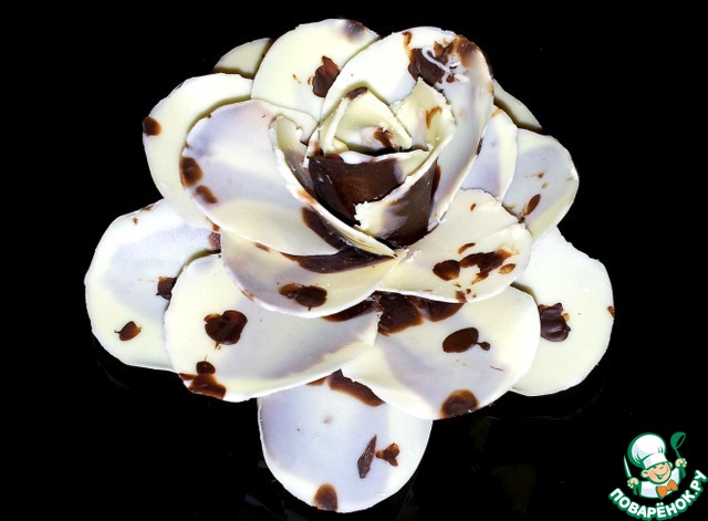 Стружка приготовлена заранее: шоколад растопить на водяной бане и вылить его на противень. Разровнять до тонкого слоя. Шоколад застыл. Стружку делать металлической или твёрдой пластмассовой лопаткой.