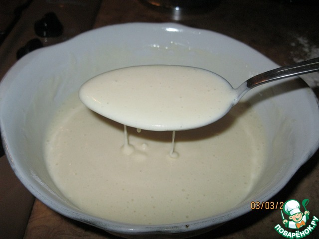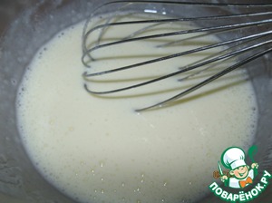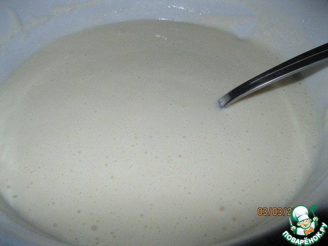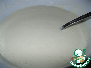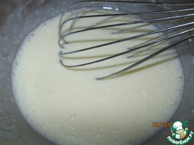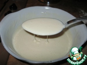 Теперь постепенно вливаем молоко, размешивая венчиком, до консистенции сметаны