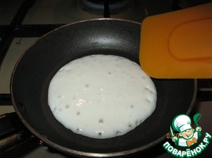 Нагрели сковороду с антипригарным покрытием на огне, чуть меньше среднего. Выливаем большой ложкой (вместимостью 2 стол. лож.) на середину сковороды, ждем появления на поверхности пузырьков