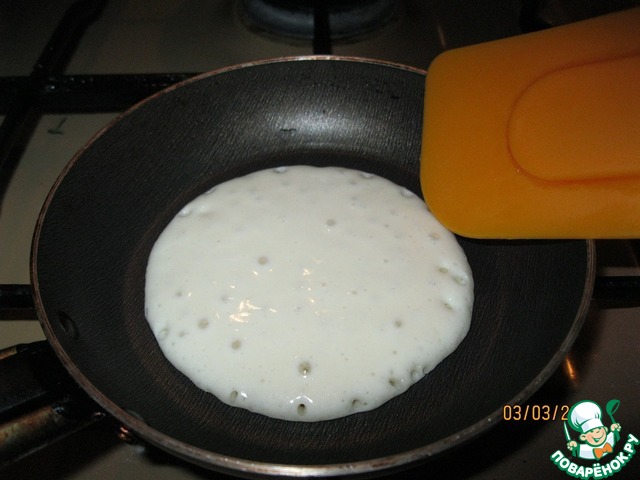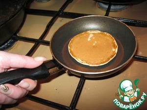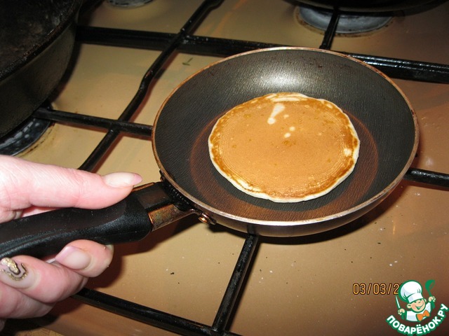 У меня такая вот масенькая сковородочка, словно спец. посуда под панкейк. Перевернули, не прозевать-зарумянилась обратная сторона-снимаем