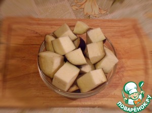 • Баклажан нарезать на крупные куски, обильно посыпать солью и оставить на 15-20 мин.