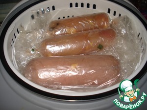В чашу мультиварки влить 0,5 литра воды. Рулетики положить в емкость пароварки. -